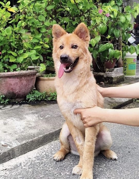 Looking at this chunky boy with beautiful golden fur, we almost forgot that he was once a stray dog. We named him Bin (means Battery in English). When we first rescued him, he had severe skin issues that caused his hair to fall out badly, exposing his thin body. Besides, he also had a blood infection and parasites.
