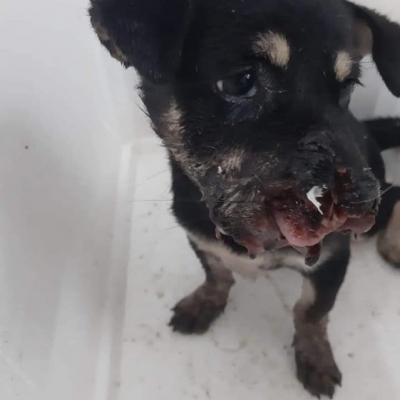 May là bé chó nhỏ tầm 3 tháng tuổi, đi lạc vào một ngôi chùa trong tình trạng miệng bị hoại tử rất nặng. May mắn là May gặp được người báo tin tốt bụng đã cố gắng đưa qua phòng khám điều trị, đồng thời hỗ trợ cho May thêm một phần chi phí.