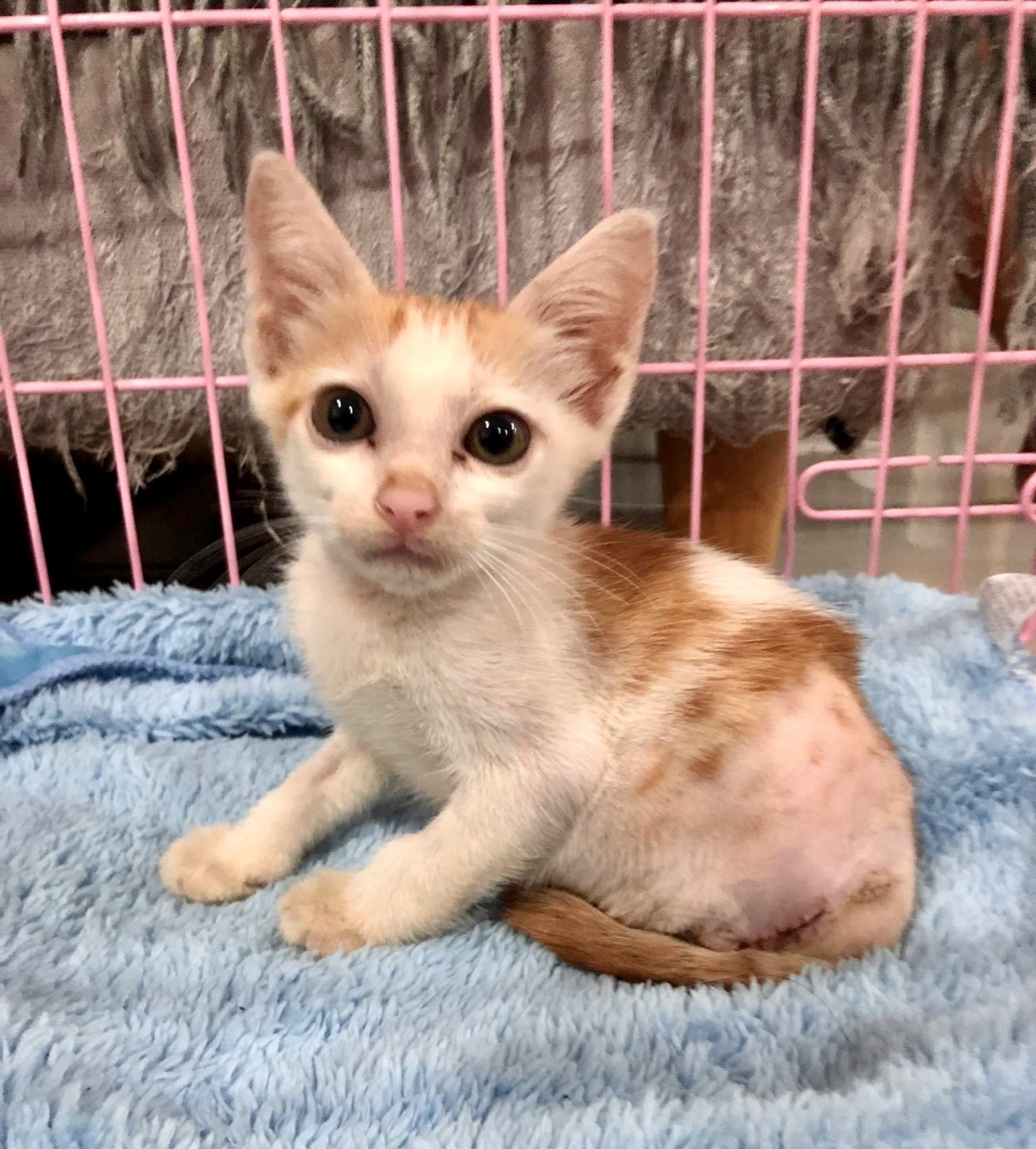 Roset #CODE22M069, was abandoned in an old factory, she had to drag her injured little legs looking for help. Fortunately, somebody saw her and reported to us but one of her legs had to be removed because it was badly injured.