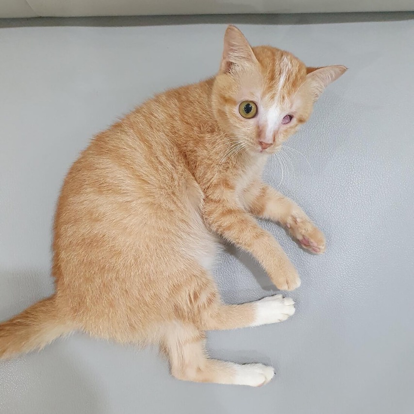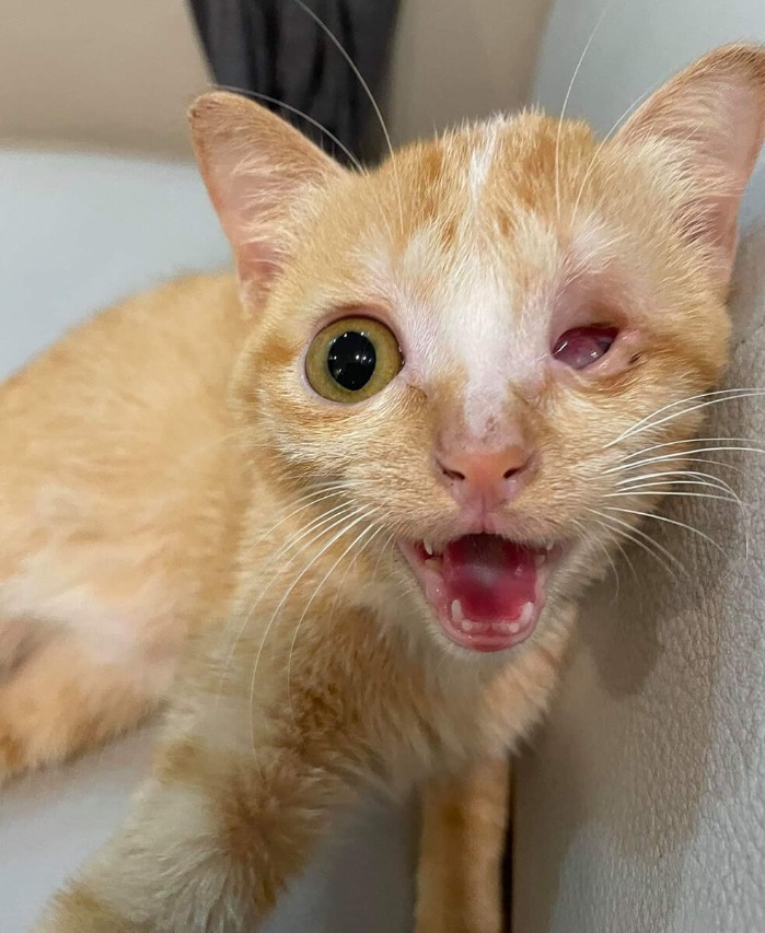 Mèo mẹ vào nhà của báo tin đẻ con sau đó bỏ đi, ba đứa bé đói phải bò ra, trong đó có Cộng #CODE21M095 với mắt trái sưng to, đóng vảy. Phòng khám tiến hành phẫu thuật bỏ mắt, hiện tại Cộng đủ điều kiện tìm chủ yêu thương.